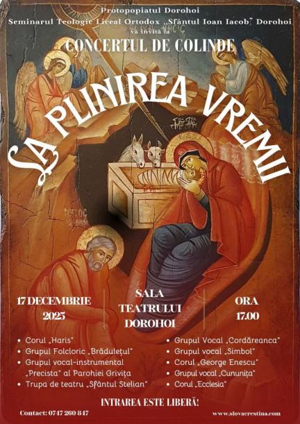Protopopiatul Dorohoi și Seminarul Teologic Liceal Ortodox „Sfântul Ioan Iacob” Dorohoi organizează Concertul de Colinde „La plinirea vremii”, un eveniment dedicat bucuriei și tradiției creștine a Nașterii Domnului.